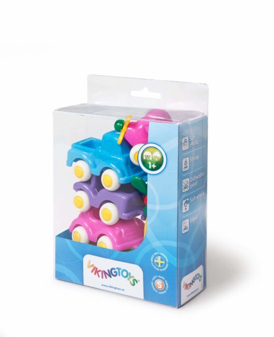 Viking toys are made of soft, pliable plastic with smooth round forms and no sharp edges and are made with heavy duty rust proof steel axels, thick-walled to withstand tough play indoors or out These bright and colorful assorted vehicles are suitable for children of all ages and are designed to awaken the child’s imagination and fantasy and entice them to play.